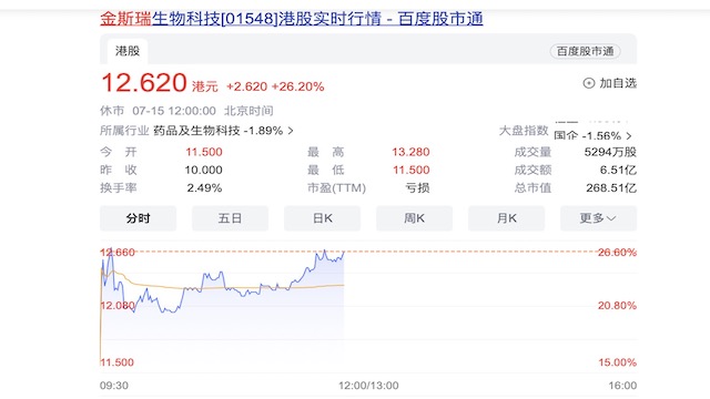 7月15日上午,在港股上市的金斯瑞生物科技(01548.HK)股价大涨26.20%,股价大涨背后,与一则传言有关。